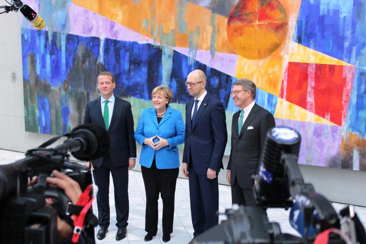 Die Bundeskanzlerin nahm diesen Ball direkt auf: Das Freihandelsabkommen, das die EU mit der Ukraine zum 1. Januar 2016 in Kraft setzen wolle, sei eine Chance für den Reformprozess in der Ukraine und nicht gegen Russland gerichtet. „Im Gegenteil: Wir wollen gute Wirtschaftsbeziehungen der Ukraine mit der Europäischen Union, zu Deutschland, aber gleichermaßen auch zu Russland.“ In der Langzeitperspektive sei ein Zusammenwachsen beider Wirtschaftsräume das Ziel. „Deshalb ist es auch so wichtig, dass die trilateralen Gespräche zwischen der Europäischen Union, der Ukraine und Russland zur Umsetzung des Freihandelsabkommens konstruktiv und zielorientiert fortgeführt werden.“