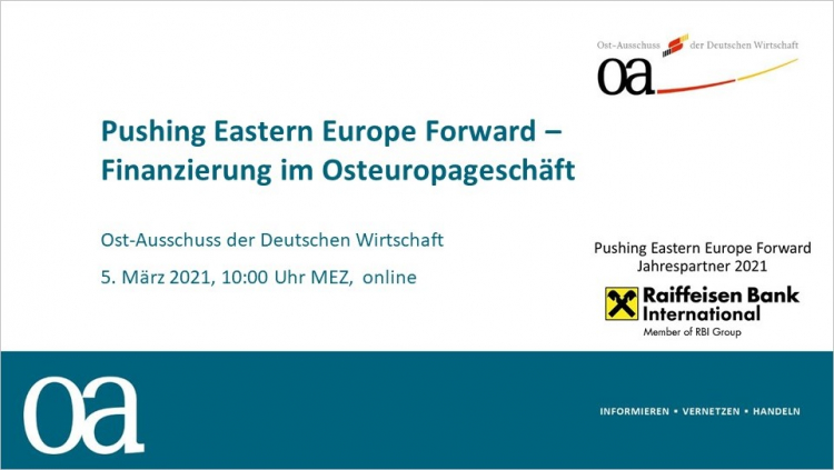 05.03.2021 Dritte Ausgabe der Ost-Ausschuss-Reihe „Pushing Eastern Europe Forward“/ Thema Finanzierungen im Osteuropa-Geschäft < > Kontakt Download Präsentation EBRD (PDF) Präsentation RBI (PDF) Präsentation sms group (PDF)
