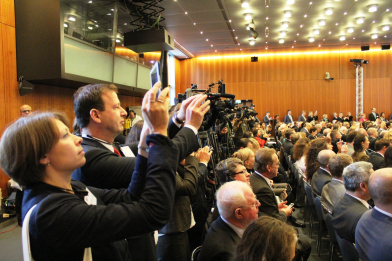 „Business braucht Frieden. Er ist die Voraussetzung für Aufschwung und Wirtschaftsentwicklung“, sagte Ost-Ausschuss-Vorsitzender Eckhard Cordes, als er zusammen mit DIHK-Präsident Eric Schweitzer die Konferenz eröffnete. Der Frieden in der Ukraine, lobte Cordes die Bundeskanzlerin, sei Dank des Minsk-Abkommens in den vergangenen Wochen etwas sicherer geworden. Zudem sei es der ukrainischen Regierung durch „beherzte Reformen“ gelungen, die Währung des Landes zu stabilisieren, eine Umschuldung auf den Weg zu bringen und die rasante Talfahrt der Wirtschaft zu beenden. „Das sind beachtliche Ergebnisse, die höchste Anerkennung verdienen. Aber sie markieren noch nicht das Ende der notwendigen Reformen in Wirtschaft und Gesellschaft. Darüber sind wir uns alle einig“, so Cordes und verwies auf die weiter bestehenden Probleme mit fehlender Rechtssicherheit und Korruption. Für ein nachhaltiges Wirtschaftswachstum sei zudem die Erhaltung der traditionell engen wirtschaftlichen Verbindungen nach Russland und in die Länder der Eurasischen Wirtschaftsunion wichtig. „Langfristig ist es unser Ziel, dass sowohl die Ukraine als auch Russland Teil eines gemeinsamen Europäischen Wirtschaftsraums werden.“