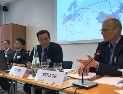 07.05.2018 Trojanisches Pferd oder Zukunftschance? Die chinesische Belt-and-Road-Initiative (BRI) zur Entwicklung einer modernen Seidenstraße in die EU gibt Rätsel auf. < > Eröffnungs-Panel mit Volker Treier (DIHK); Fridolin Strack (BDI); Hu Zhiago (Chinesische Akademie der Wissenschaften). Fotos: Andreas Metz Jens Bastian (Südosteuropagesellschaft) bereitete mit seinem Eingangsstatement den Boden für eine spannende Diskussion Idyllisch im Berliner Grunewald gelegen: die Europäische Akademie PreviousNext Kontakt