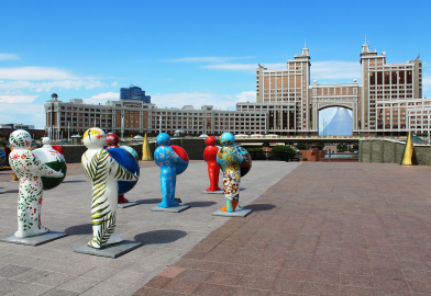 Wer durch die Innenstadt der Hauptstadt Astana läuft, fühlt sich Asien sehr fern und der Zukunft ganz nah. So ungefähr könnten erste menschliche Großsiedlungen auf dem Mars oder einem anderen Planeten aussehen. Was noch fehlt, sind fliegende Untertassen, geeignete Straßenschluchten für sie wären bereits vorhanden. Einstweilen müssen Mietfahrräder ausreichen, im Zentrum entstehen entsprechende Ausleihstationen gerade an jeder zweiten Ecke.