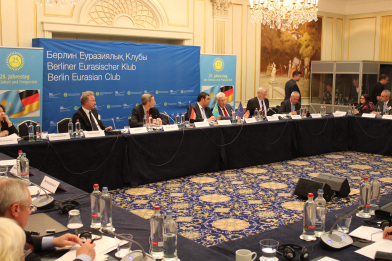 In der vorangehenden Diskussion erörterten deutsche und kasachische Experten die Dimensionen der Energiebeziehungen im eurasischen Raum. Ost-Ausschuss-Geschäftsführer Harms bezeichnete Deutschland und Kasachstan als „Ankerländer im eurasischen Dialog“ und hob die Bedeutung des BEK als wichtige Dialogplattform hervor. Diese war 2012 anlässlich eines Besuchs des kasachischen Präsidenten Nursultan Nasarbajew in Berlin ins Leben gerufen worden. Seit Juli 2016 ist der Ost-Ausschuss deutscher Kooperationspartner des BEK. Kasachstans Botschafter in Berlin Bolat Nussupov unterstrich die Bedeutung Kasachstans als Energielieferant für Deutschland: „Jeder dritte Liter Benzin in Deutschland stammt aus kasachischem Öl.“ Hans Rhein von der Energiedirektion der Europäischen Kommission wies auf die enge Zusammenarbeit der EU mit Kasachstan im Rohstoff- und Energiesektor hin, die im bilateralen Partnerschafts- und Kooperationsabkommen eine große Rolle spiele. Dabei seien erneuerbare Energien und Energieeffizienz „wichtige Themen unseres Energiedialogs“.