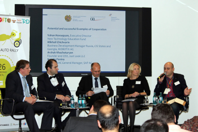 Nach einer Präsentation des IT-Sektors der Kaukasus-Republik durch Vahan Hovsepyan, den Geschäftsführer des armenischen New Technology Education Funds, stand eine Podiumsdiskussion auf dem Programm, auf der Kooperationsmöglichkeiten und -beispiele präsentiert wurden. Mikhail Chichvarin, Business Development Manager für Russland/GUS, beim deutschen Kamera- und Videosystem-Spezialisten Mobotix, und Arshak Khachaturyan, CEO seines armenischen Vertriebspartner Just Look LLC, gaben ein Beispiel für eine bestehende Kooperation. Natalia Panina von SAP, verantwortlich für das Geschäft mit öffentlichen Unternehmen in Osteuropa, wies auf die Geschäftsmöglichkeiten hin, die sich durch neue Trends in der digitalen Wirtschaft wie Digital Government oder Cloud-basierte Anwendungen ergäben. SAP hat in jüngster Zeit die armenische Zentralbank und einen großen Einzelhändler als Kunden gewinnen können und setzt auf den Ausbau des Geschäfts mit Armenien. Anschließend hatten Referenten und Teilnehmer Gelegenheit, in bilateralen Gesprächen weitere deutsch-armenische Kooperationen anzubahnen.