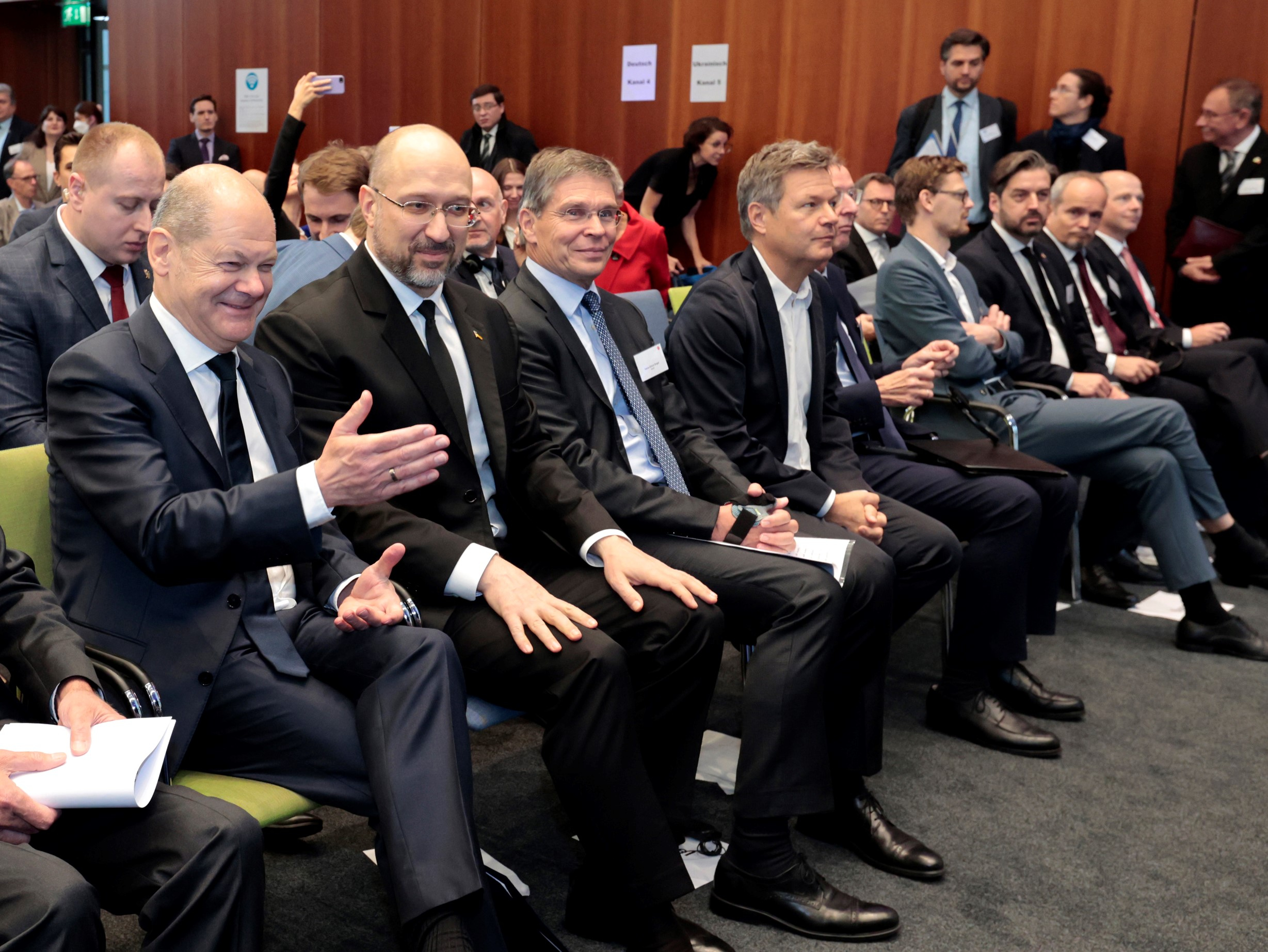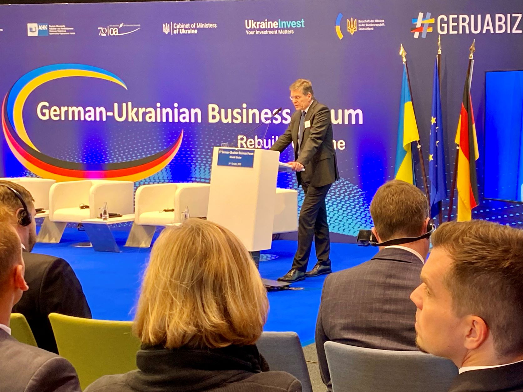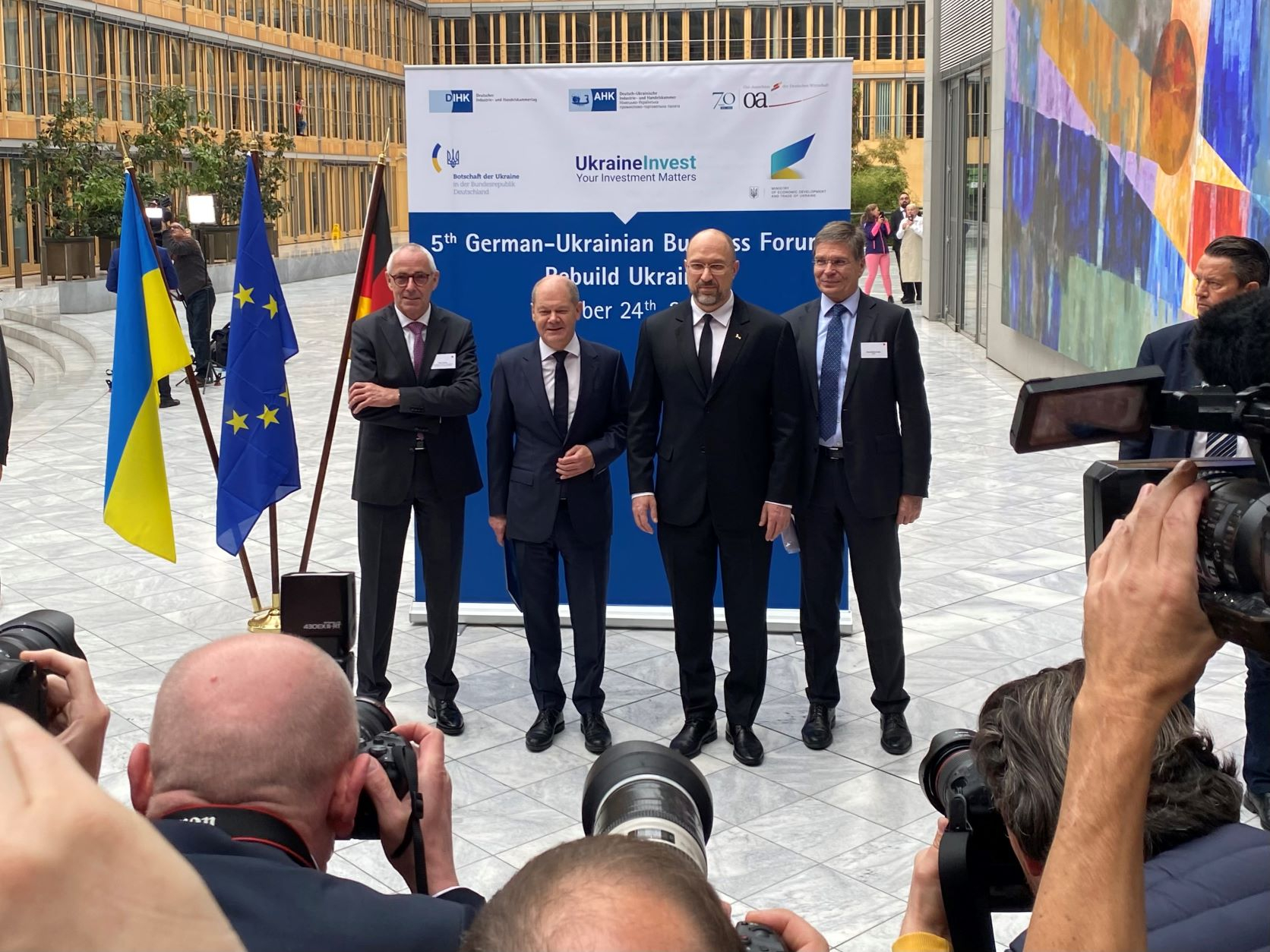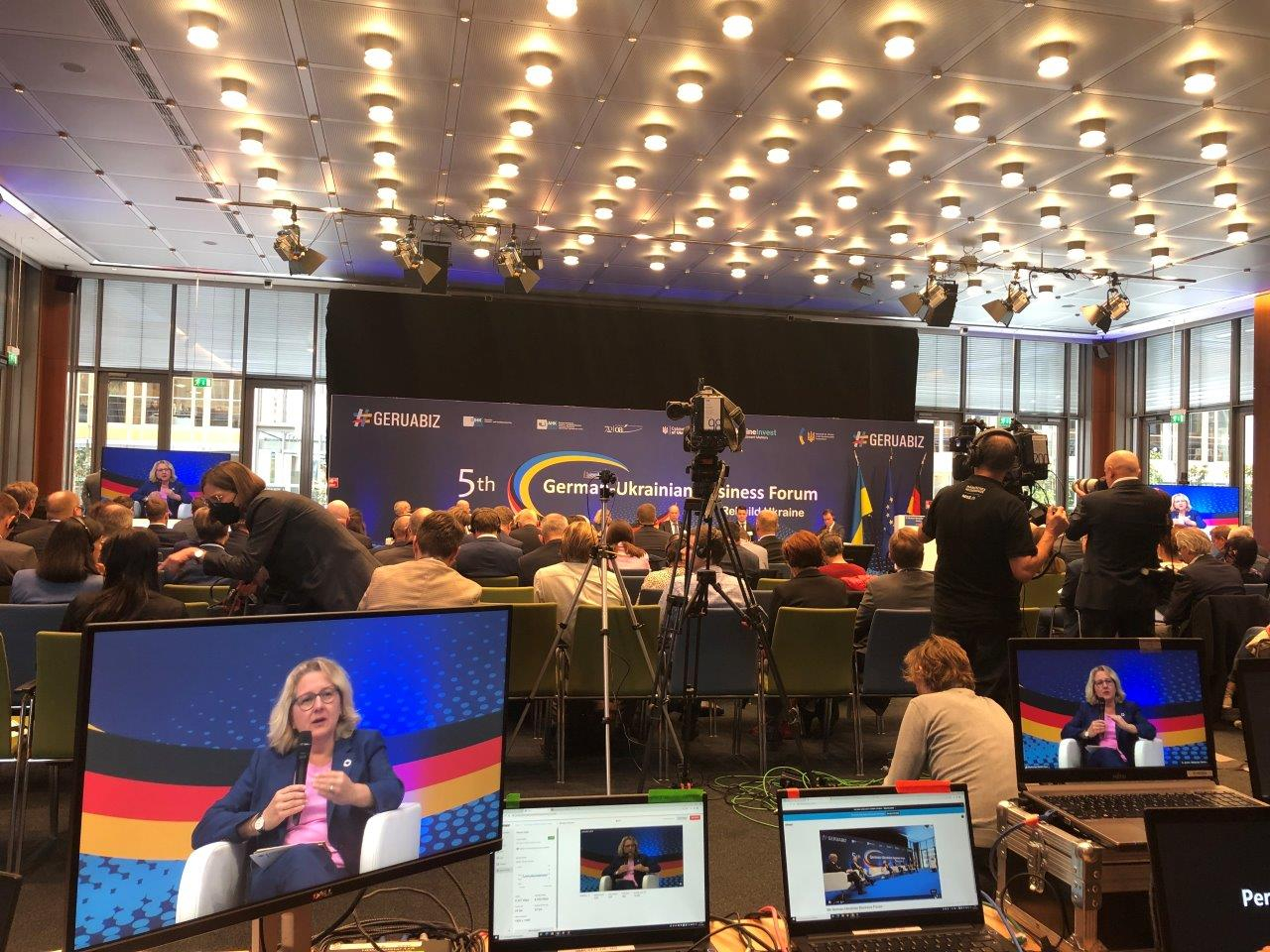 Bundeskanzler Olaf Scholz und der ukrainische Premierminister Denys Schmyhal eröffneten am 24. Oktober 2022 das 5. Deutsch-Ukrainische Wirtschaftsforum in Berlin. An den anschließenden Panel-Diskussionen nahmen unter anderem Vizekanzler Robert Habeck, die ukrainische Vize-Premierministerin Yulia Svyrydenko, Bundesentwicklungsministerin Svenja Schulze sowie weitere Regierungsmitglieder und Unternehmensvertreter aus der Ukraine und Deutschland teil. Im Zentrum der Veranstaltung standen Pläne und Projekte zum Wiederaufbau des kriegszerstörten Landes. Der große Andrang bei der Konferenz, die zudem per Livestream übertragen wurde, zeigte das breite Interesse der deutschen Wirtschaft, sich beim Wiederaufbau zu engagieren.