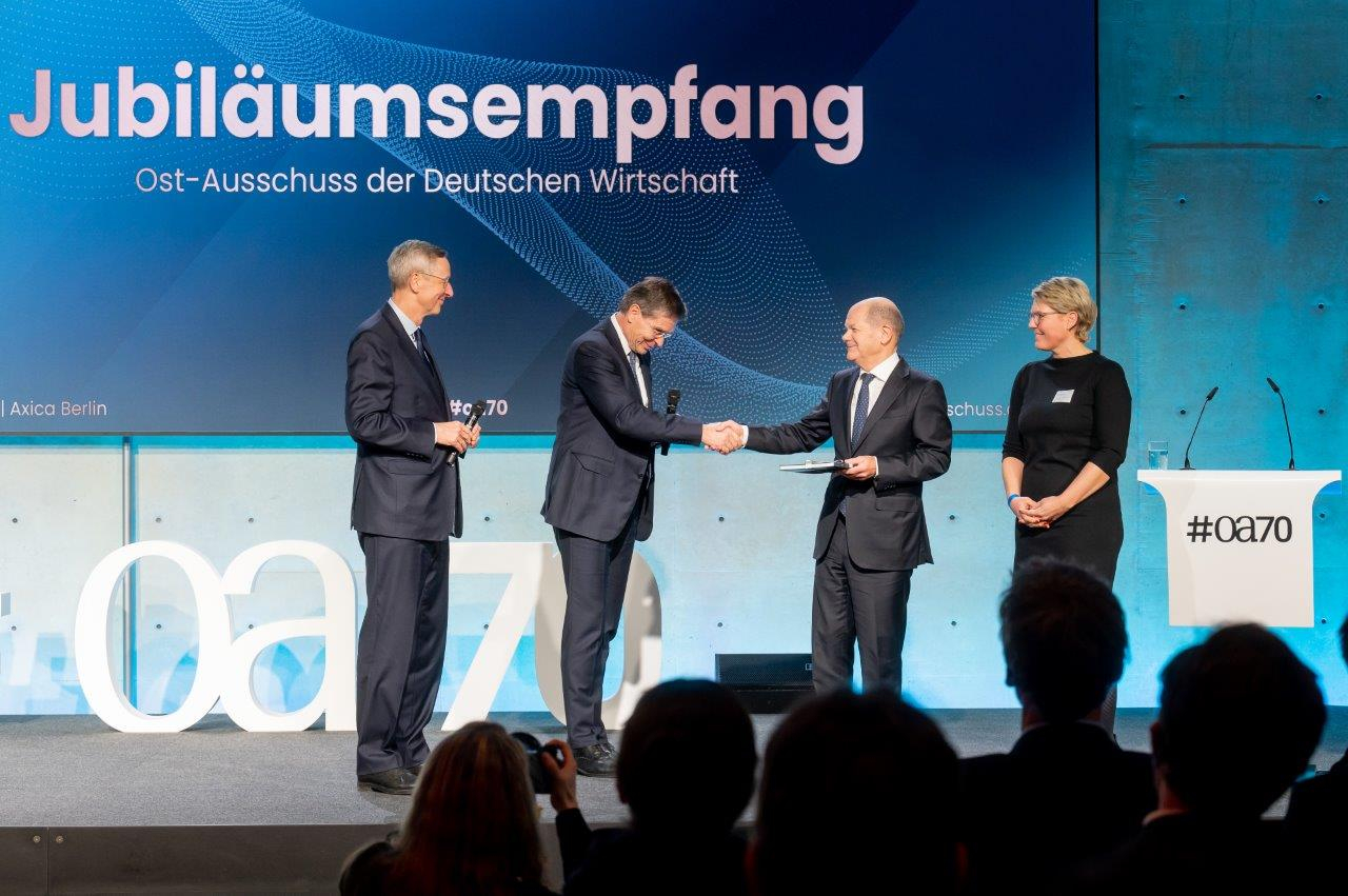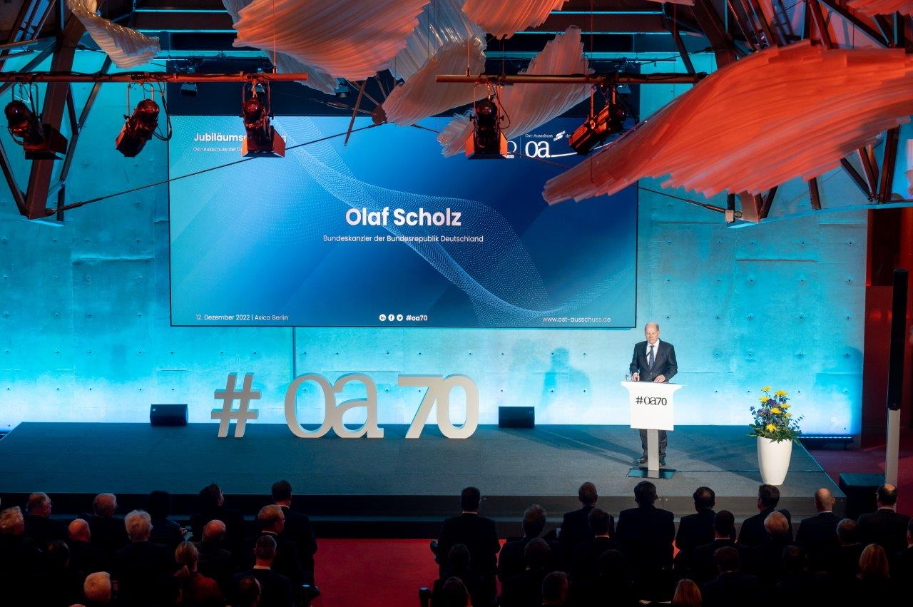 Mit 250 geladenen Gästen, darunter Bundeskanzler Olaf Scholz und Vizekanzler Robert Habeck, zog der Ost-Ausschuss der Deutschen Wirtschaft am 12. Dezember 2022 in der Berliner Axica eine Bilanz seiner 70-jährigen Geschichte und schärfte den Blick für anstehende Herausforderungen. „Der Ost-Ausschuss ist ein Pionier“, lobte der Bundeskanzler das Geburtstagskind. Im Hinblick auf die Unterstützung der Ukraine, die Fortsetzung der EU-Erweiterung Richtung Ost- und Südosteuropa und die Umsetzung der Energiewende sei dieser Pioniergeist nun besonders gefragt.