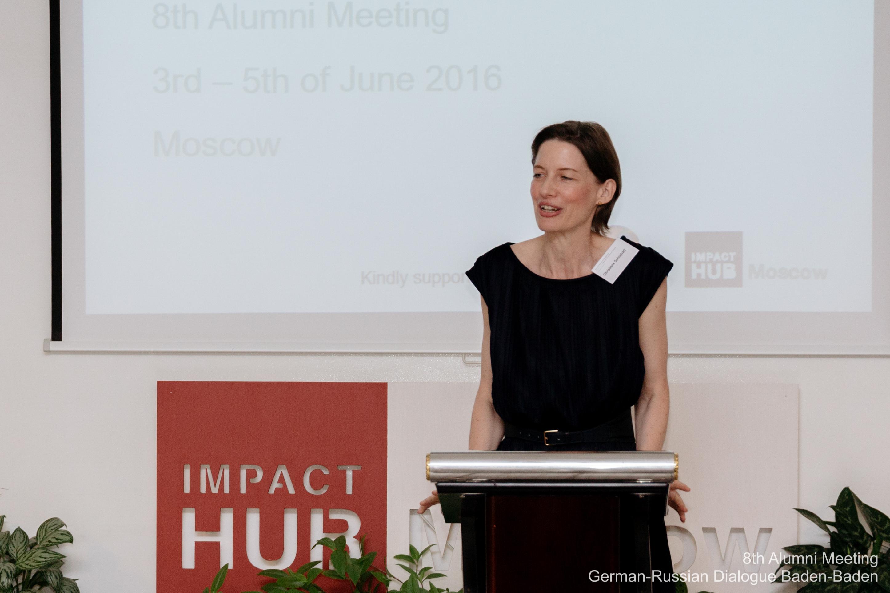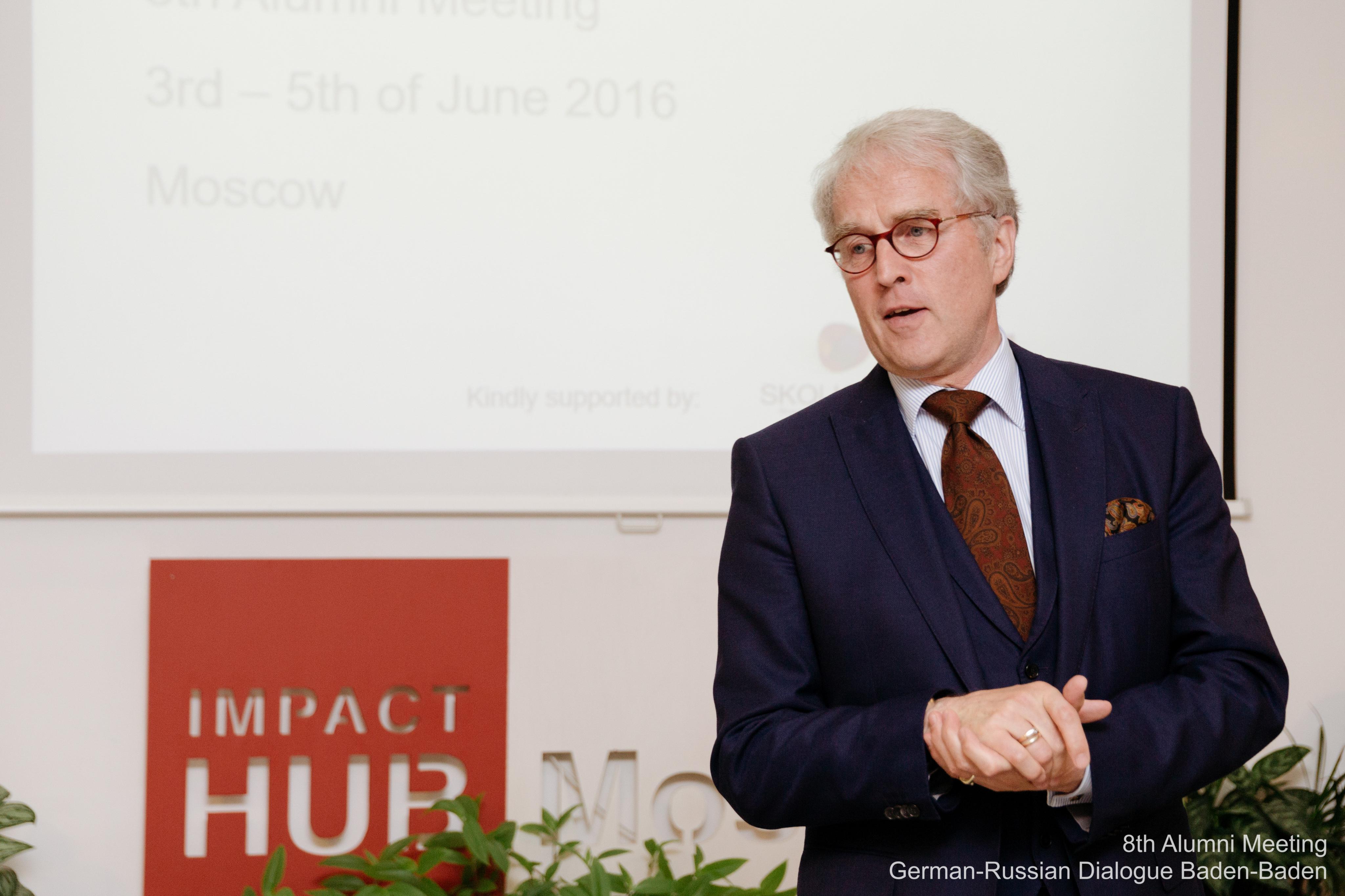 Als Veranstaltungsort für das feierliche Dinner wurde der Impact Hub Moscow gewählt, eine Vereinigung von lokalen und internationalen sozialen Unternehmen, Experten aus Wirtschaft, NGOs und Wissenschaft. Die Gründer von Impact Hub Moscow, ehemalige Teilnehmer der Deutsch-Russischen Gespräche Baden-Baden (DRGBB), konnten am konkreten Beispiel die Möglichkeiten und Herausforderungen der Arbeit von sozialen Unternehmen in Russland vorstellen. Die Ehrengäste des Abends waren der Botschafter der Bundesrepublik Deutschland in der Russischen Föderation Rüdiger von Fritsch und der Rektor der Moscow School of Management Skolkowo Andrej Scharonow. Außerdem nahm der Leiter der Abteilung für internationale Beziehungen der Jegor Gaidar Stiftung Stanislaw Usatschew am Eröffnungsabend teil.
