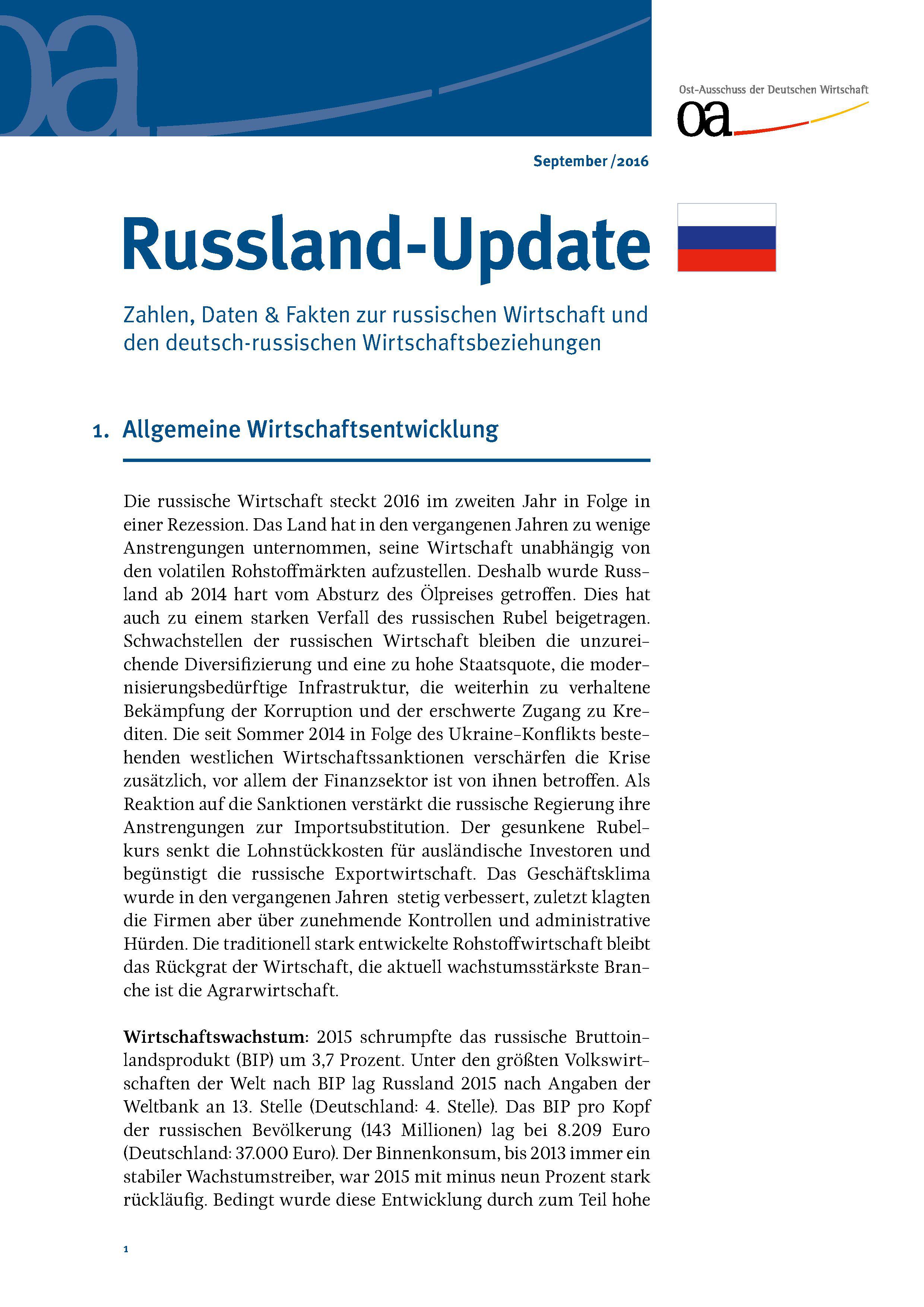 Am 18. September 2016 finden in Russland Parlamentswahlen statt. Zu Ihrer Information haben wir Ihnen auf einen Blick die wichtigsten Zahlen, Daten und Fakten zur russischen Wirtschaft und den deutsch-russischen Wirtschaftsbeziehungen zusammengestellt. Unser Russland-Update finden Sie hier als Download. Wirtschaftsporträts zu Russland und den übrigen 20 Ländern des Ost-Ausschusses der Deutschen Wirtschaft können Sie zudem jederzeit auf der Ost-Ausschuss-Seite unter dem Menüpunkt Länder einsehen. Immer zum Monatsanfang bietet Ihnen der Ost-Ausschuss zudem einen kostenlosen Newsletter mit aktuellen Berichten und Statistiken an, den Sie über unsere Homepage abonnieren können. Folgen Sie uns auch aktuell auf Twitter: @OstAusschuss