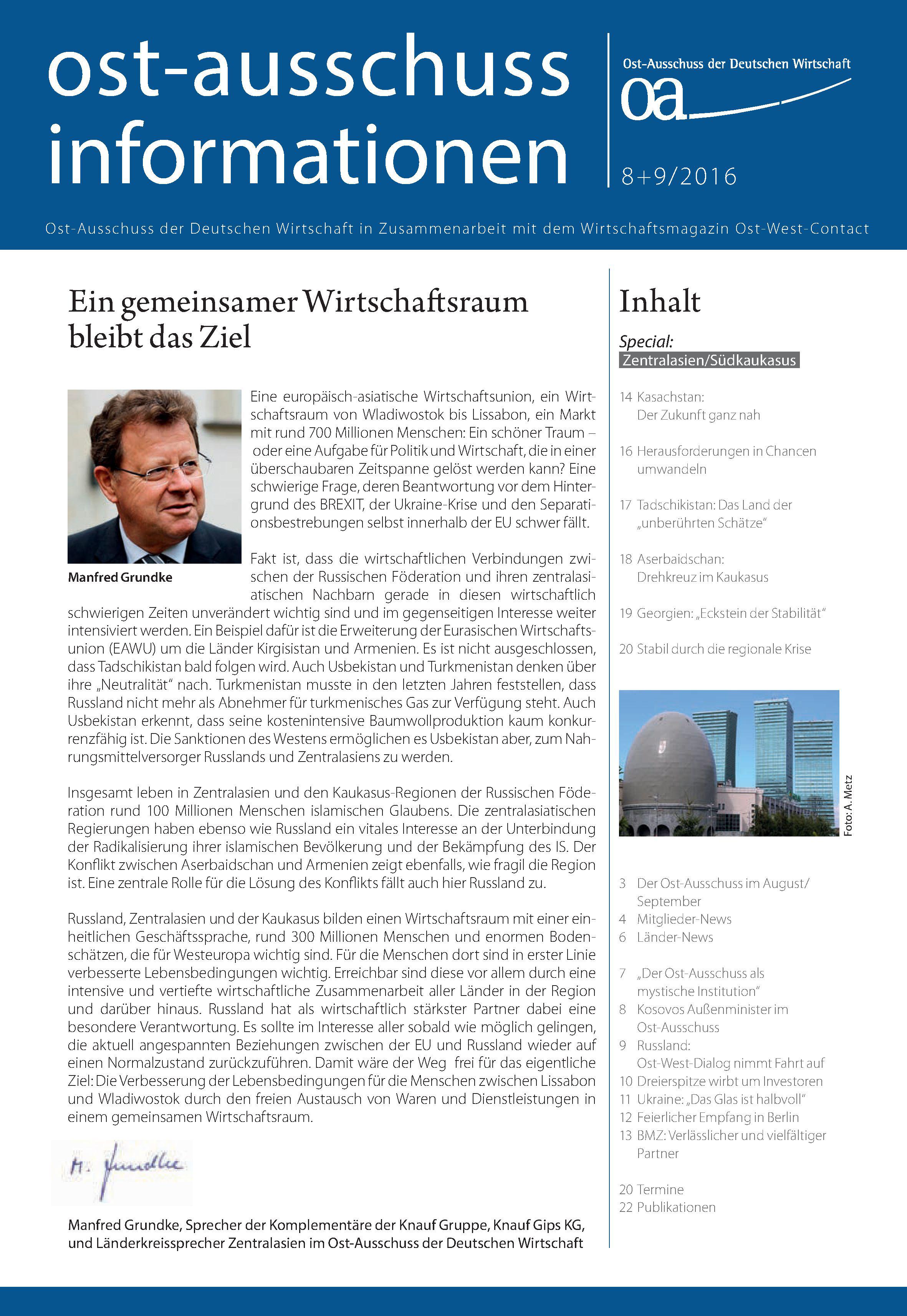 Zentralasien und der Südkaukasus sind die Schwerpunktregionen der aktuellen Ausgabe der Ost-Ausschuss-Informationen. Viele Länder dort leiden unter der russischen Wirtschaftsschwäche und dem Verfall der Rohstoffpreise. Kasachstan setzt sich deshalb verstärkt für einen Dialog zwischen der EU und der Eurasischen Wirtschaftsunion über Handelserleichterungen ein, wie eine Ost-Ausschuss-Delegation im Rahmen einer Konferenz des Berliner Eurasischen Klubs in Astana erfuhr. Die wirtschaftlichen Chancen in Aserbaidschan und Georgien standen im Blickpunkt zweier Wirtschaftsforen in Berlin im Juni, die der Ost-Ausschuss mitorganisierte oder unterstützte. Mehr über diese Veranstaltungen lesen Sie in der aktuellen Ausgabe. Außerdem beschreibt Ost-Ausschuss-Geschäftsführer Michael Harms die Eindrücke seiner jüngsten Gespräche in Kiew.