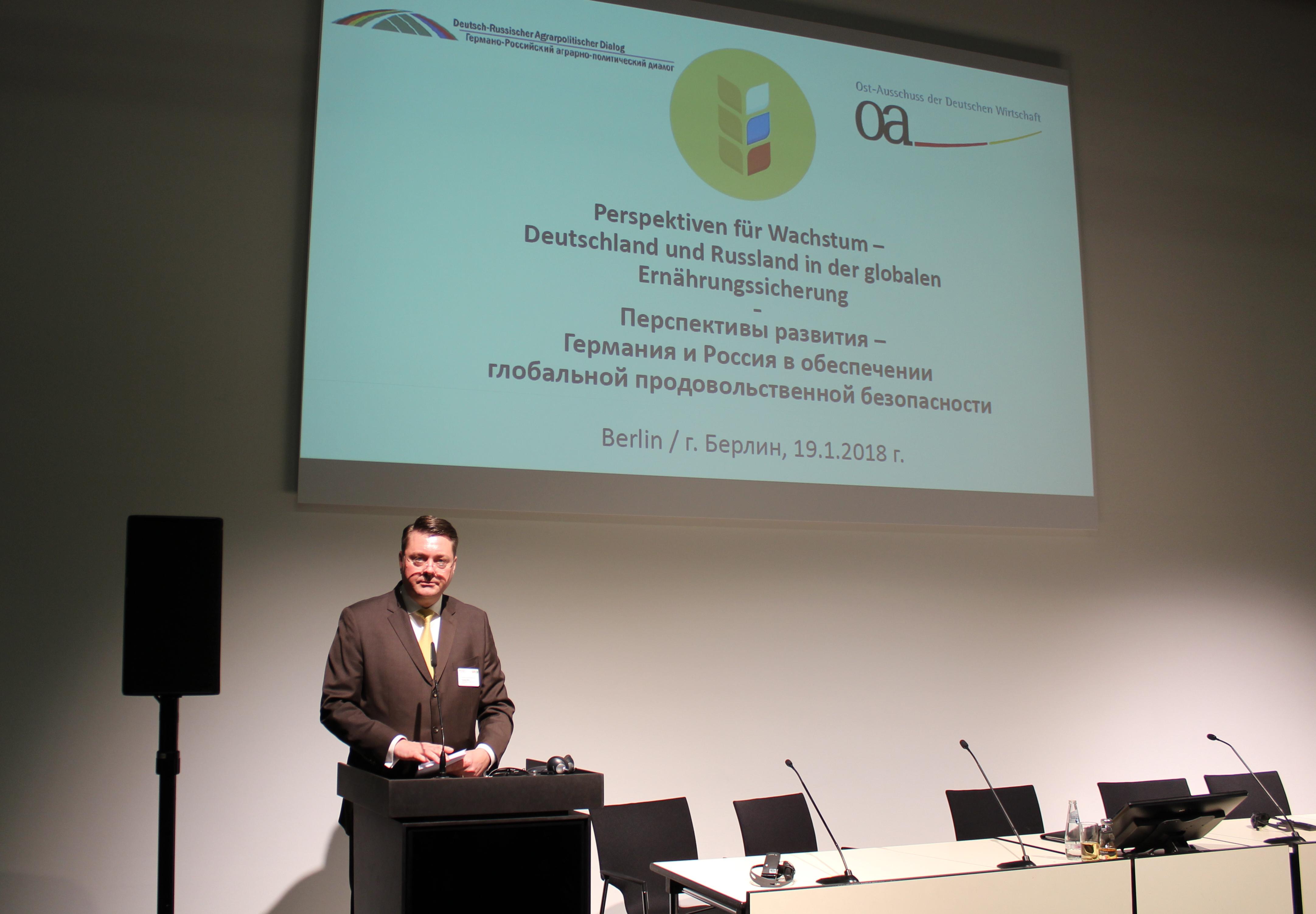 Die Rückkehr Russlands auf die Grüne Woche in Berlin nach zweijähriger sanktionsbedingter Abstinenz stieß auf großes Interesse: Über 140 Teilnehmer lockte die Podiumsdiskussion „Perspektiven für Wachstum – Deutschland und Russland in der globalen Ernährungssicherung“ an, die die AG Agrarwirtschaft beim Ost-Ausschuss der Deutschen Wirtschaft am 19. Januar gemeinsam mit dem russischen Landwirtschaftsministerium und dem Deutsch-Russischen Agrarpolitischen Dialog organisierte. Trotz bestehender Sanktionen äußerte sich der stellvertretende russische Landwirtschaftsminister Jewgenij Gromyko ausgesprochen optimistisch zu möglichen Kooperationen.